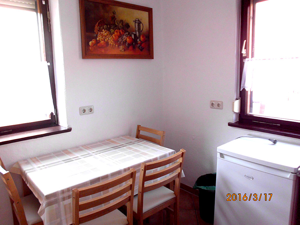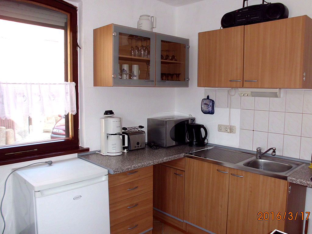 Die Küche ist mit vier Stühlen, einem Tisch, Kühlschrank mit Gefrierfach, Herd mit Backofen, Mikrowelle, Kaffeemaschine, Wasserkocher, Radio, Besteck, Geschirr, Gläser, Pfannen, Töpfe usw. ausgestattet. Monteure und Feriengäste brauchen nur persönliche Dinge mitzubringen. Durch die Vollausstattung und die damit verbundene Selbstverpflegung, ist die Fewo eine preiswerte Alternative zum Hotel. Handtücher, Duschtücher, Bettwäsche und WLAN werden von uns kostenfrei gestellt. Jahns Hof ist eine Nichtraucherwohnung. Raucher und Grillfreunde können in der Abendsonne vor der Ferienwohnung ihren Freuden nachgehen.